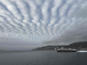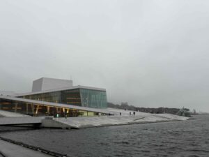 その後、ベルゲンに向かう中継として、オスロを訪れました。途中、ノルウェーの国境付近で警察に旅の目的を聞かれましたが、まったく予想しておらず、とっさに話した英語があまりに拙く、恥ずかしかったです。オスロ中央駅に到着後、近くのオペラハウスを訪れました。オペラハウスは外から屋上に登ることができる変わった建物で、そこからオスロの街並みや海を眺めることができました。ただ、天気も悪く、寒かったので早めにホテルに向かうことにしました。そんな天気でも、海に飛び込む人がいるほどのサウナ文化には感心しました。