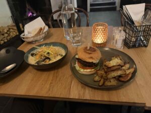 ホテルで一休みした後、レストランでフィッシュスープとハンバーガーを食べました。スープは海鮮の旨みが濃厚で、具材のサーモンもしっとりとして弾力があり、ハンバーガーも肉厚でとてもおいしかったです。値段には北欧らしさを感じましたが、後悔はなく、また食べたいと思いました。
